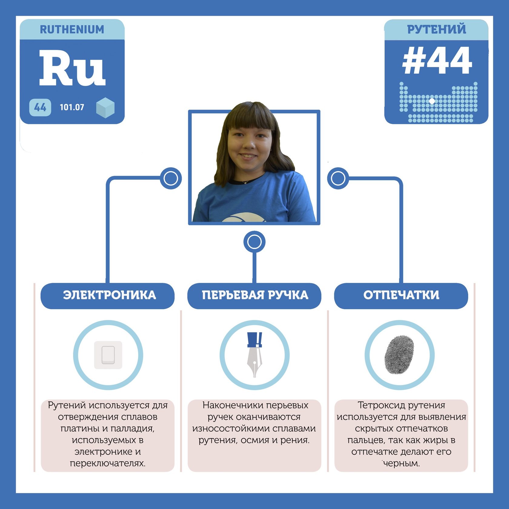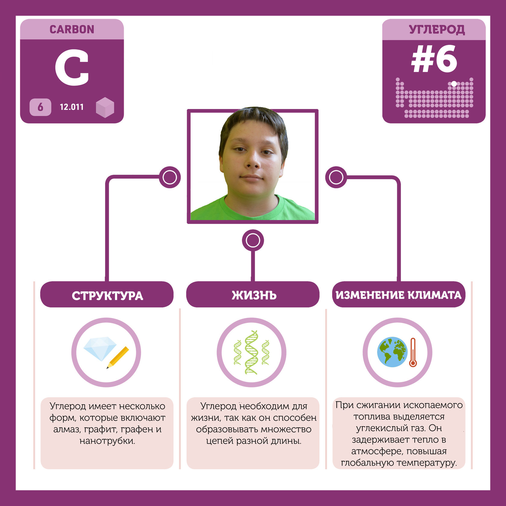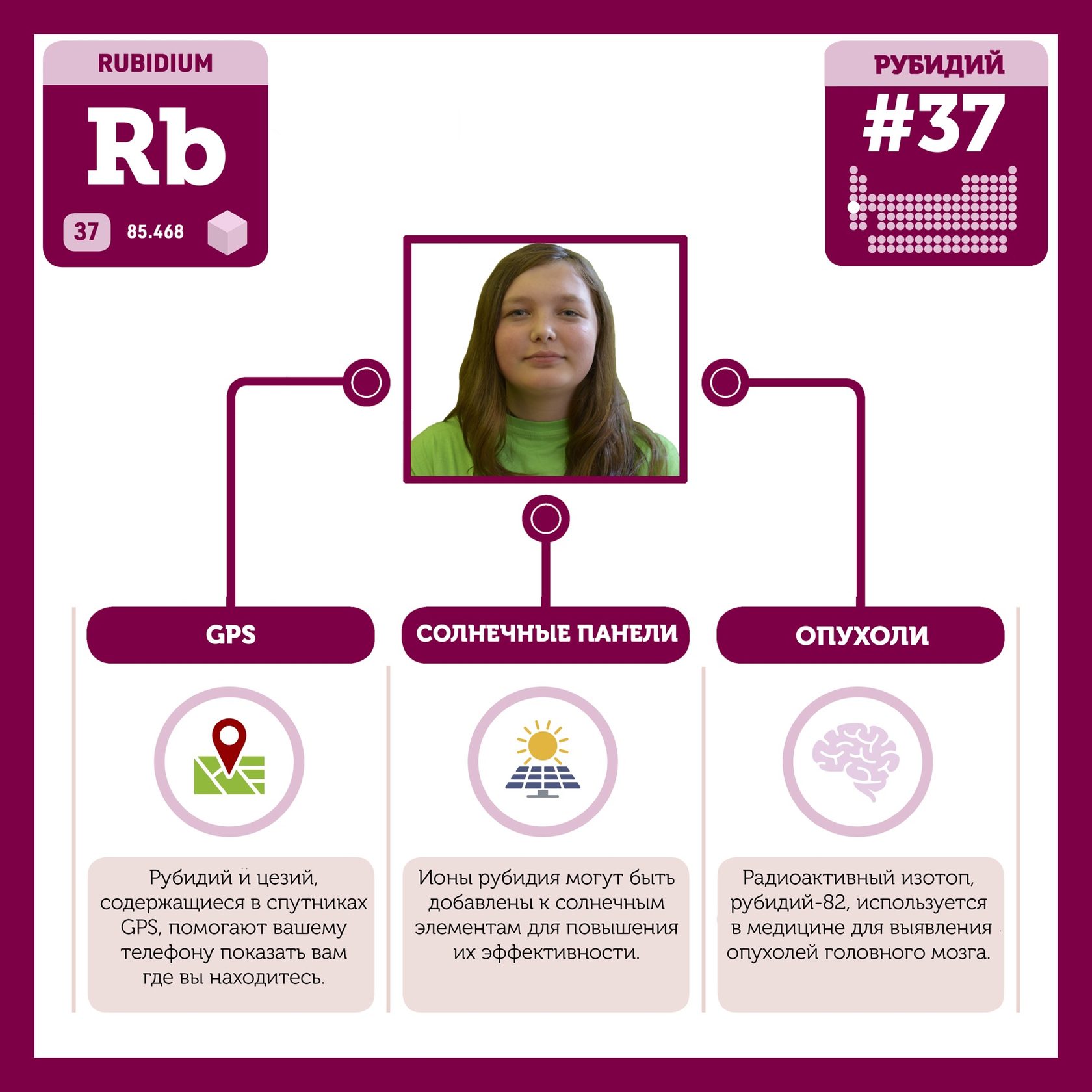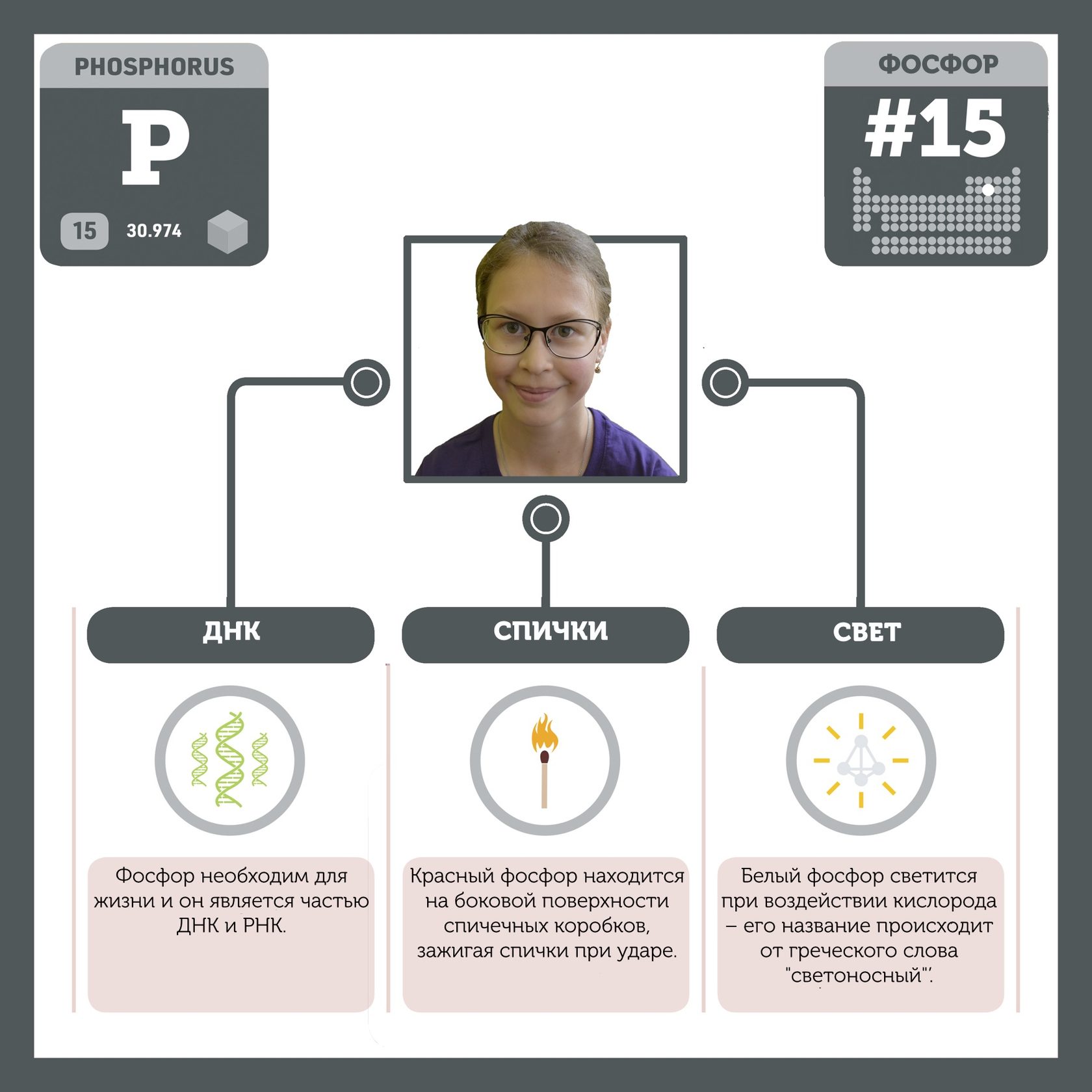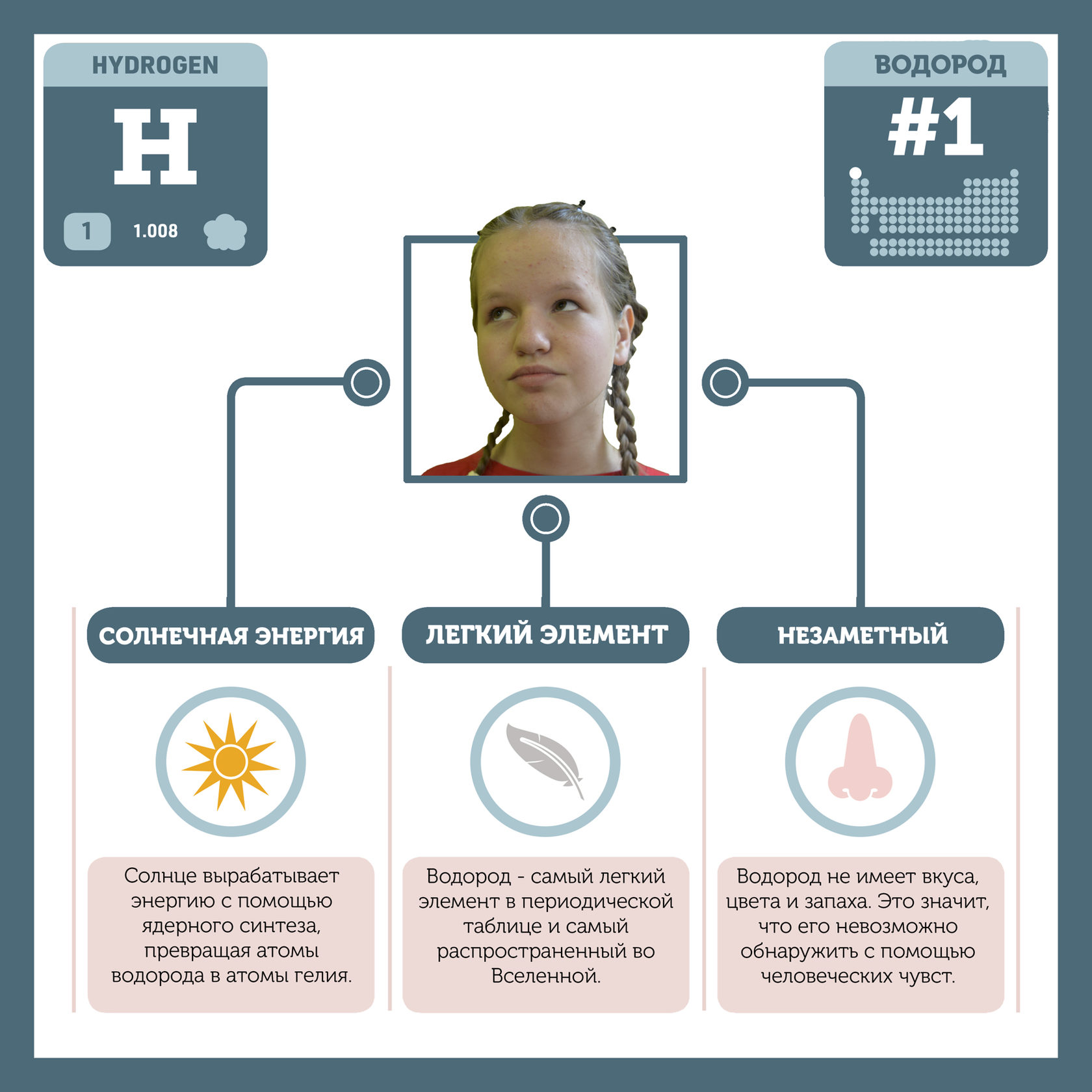 Для того, чтобы иметь возможность говорить от лица каждого элемента, ребята придумали персонажей - Росариков. Название Росарик произошло от сокращенной формулировки "участник детского отраслевого лагеря "Поколение Росатома" и по сути своей олицетворяет собой Атом вещества.