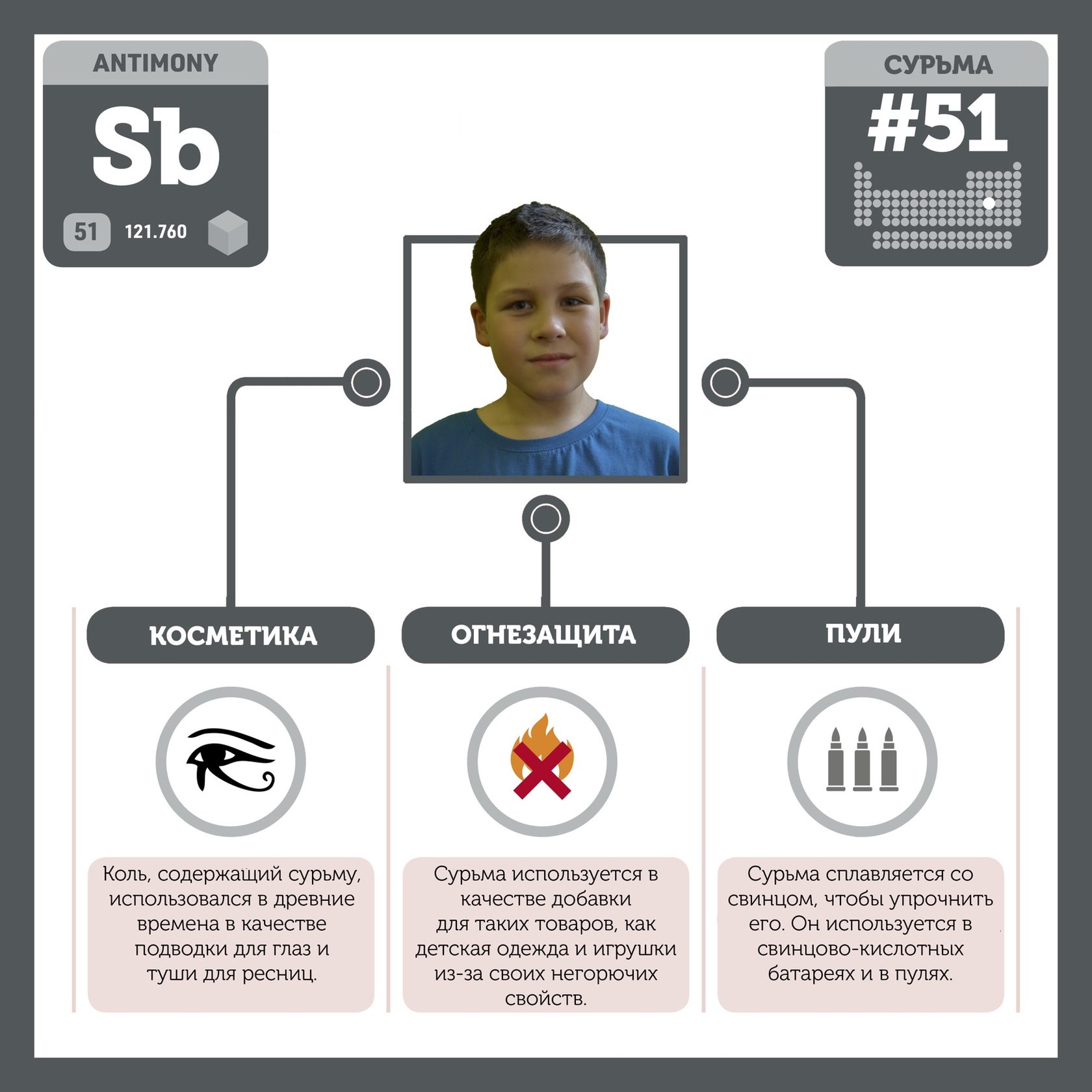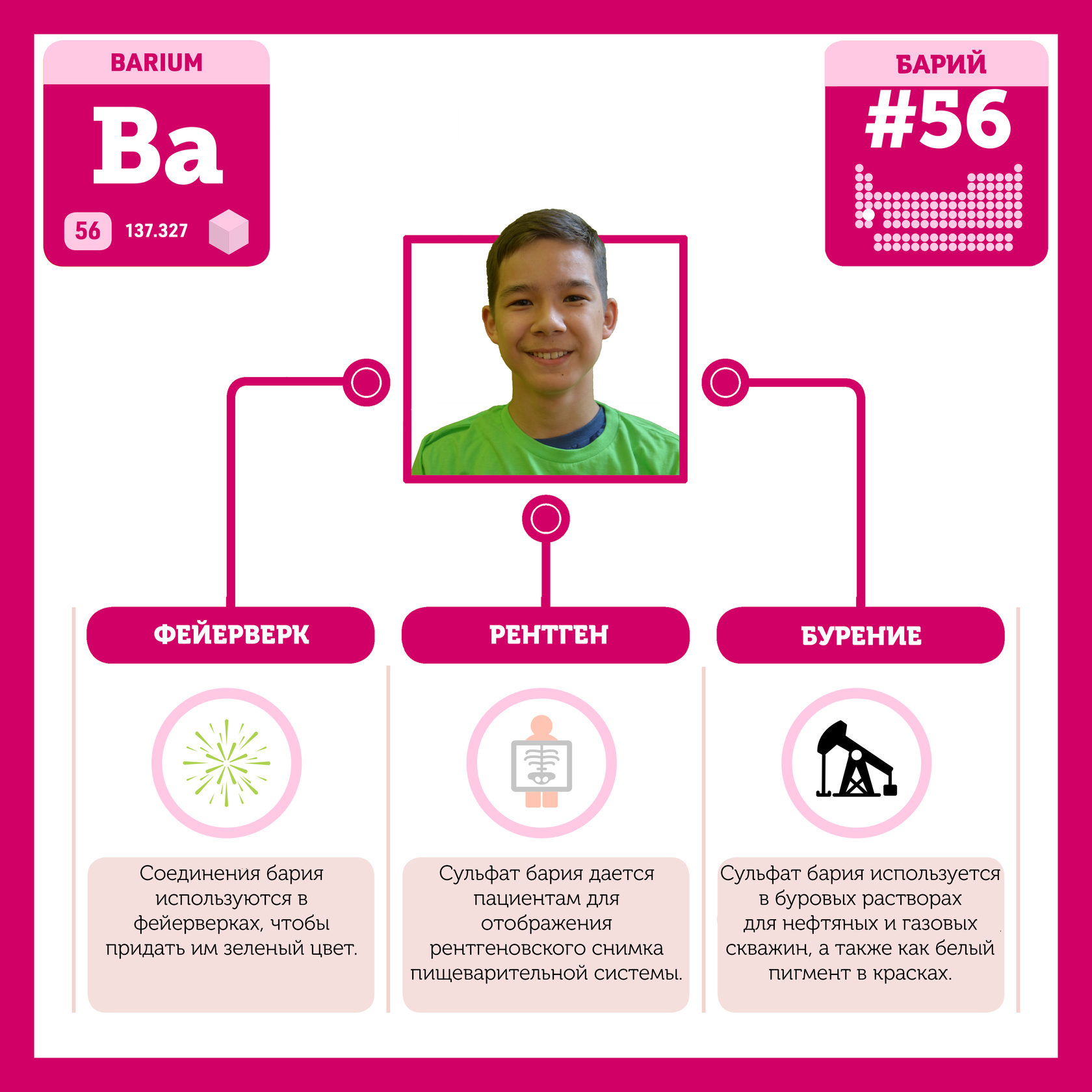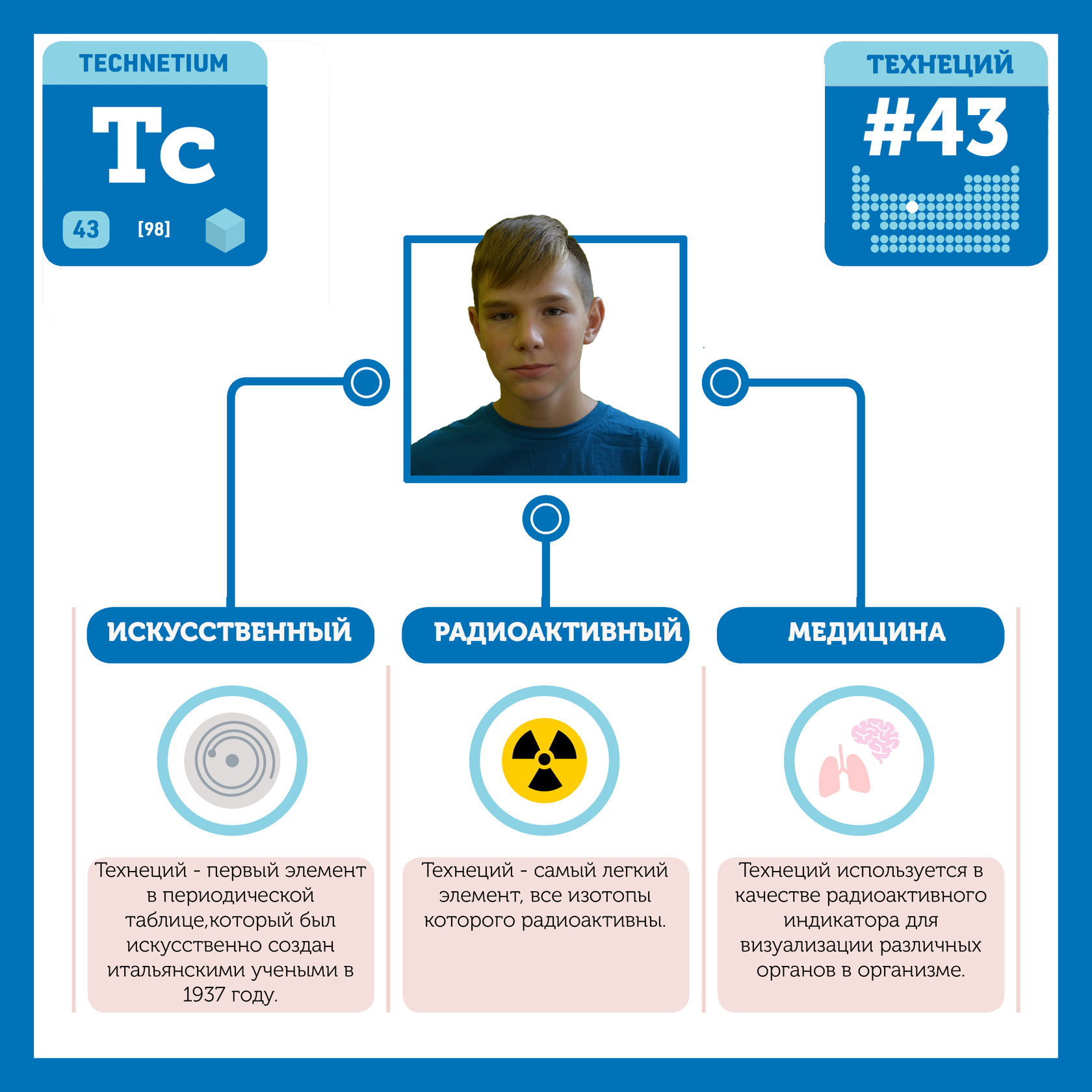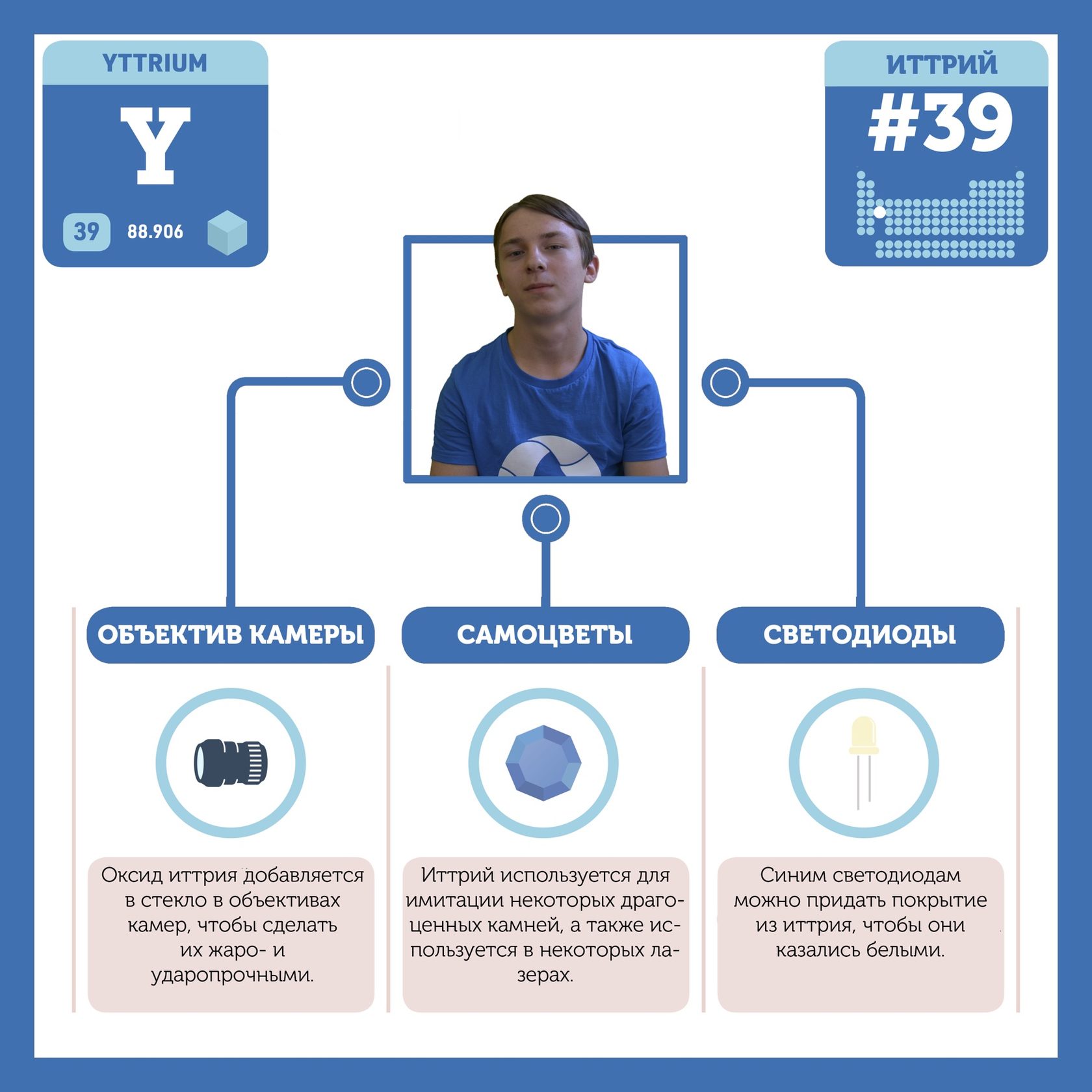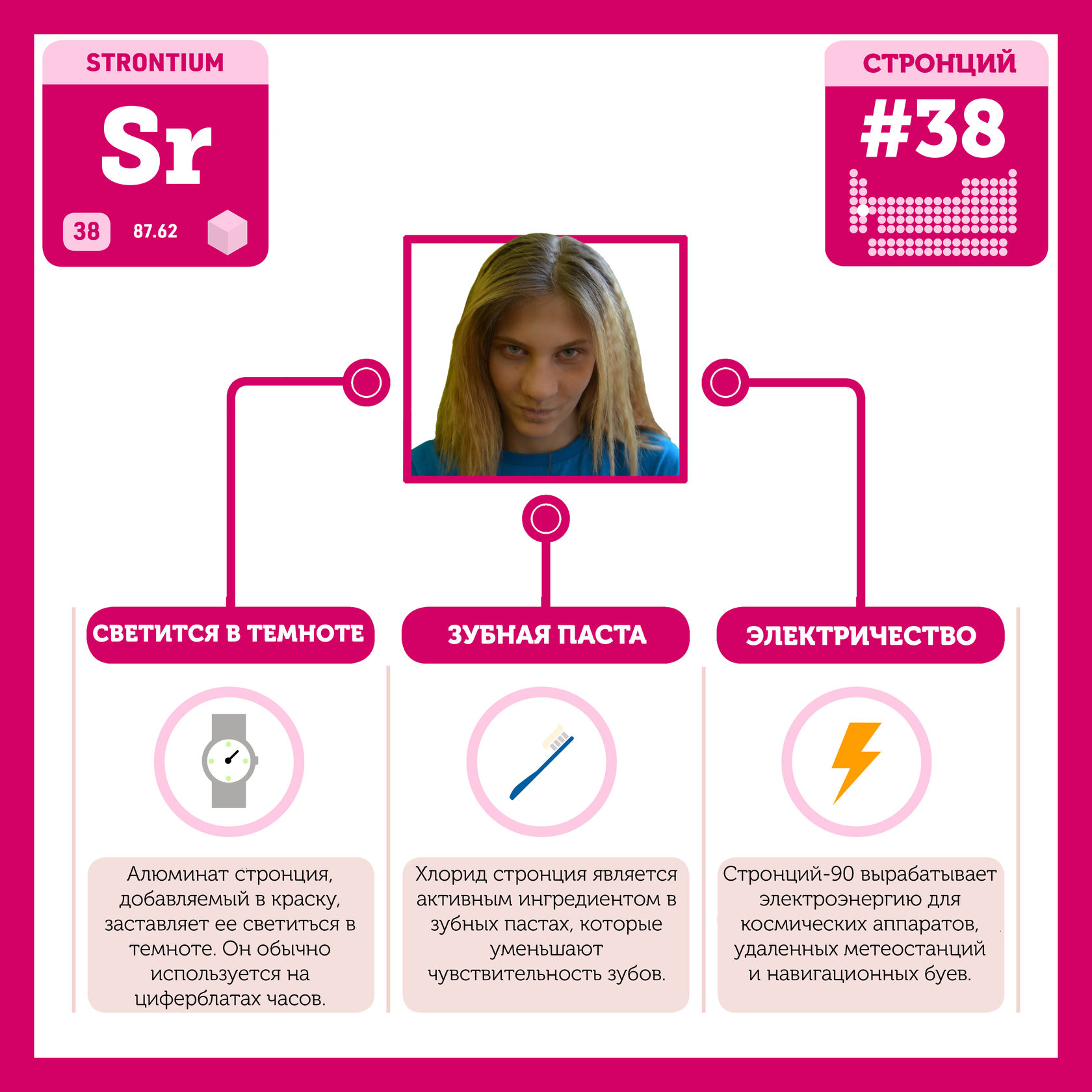 Для того, чтобы иметь возможность говорить от лица каждого элемента, ребята придумали персонажей - Росариков. Название Росарик произошло от сокращенной формулировки "участник детского отраслевого лагеря "Поколение Росатома" и по сути своей олицетворяет собой Атом вещества.