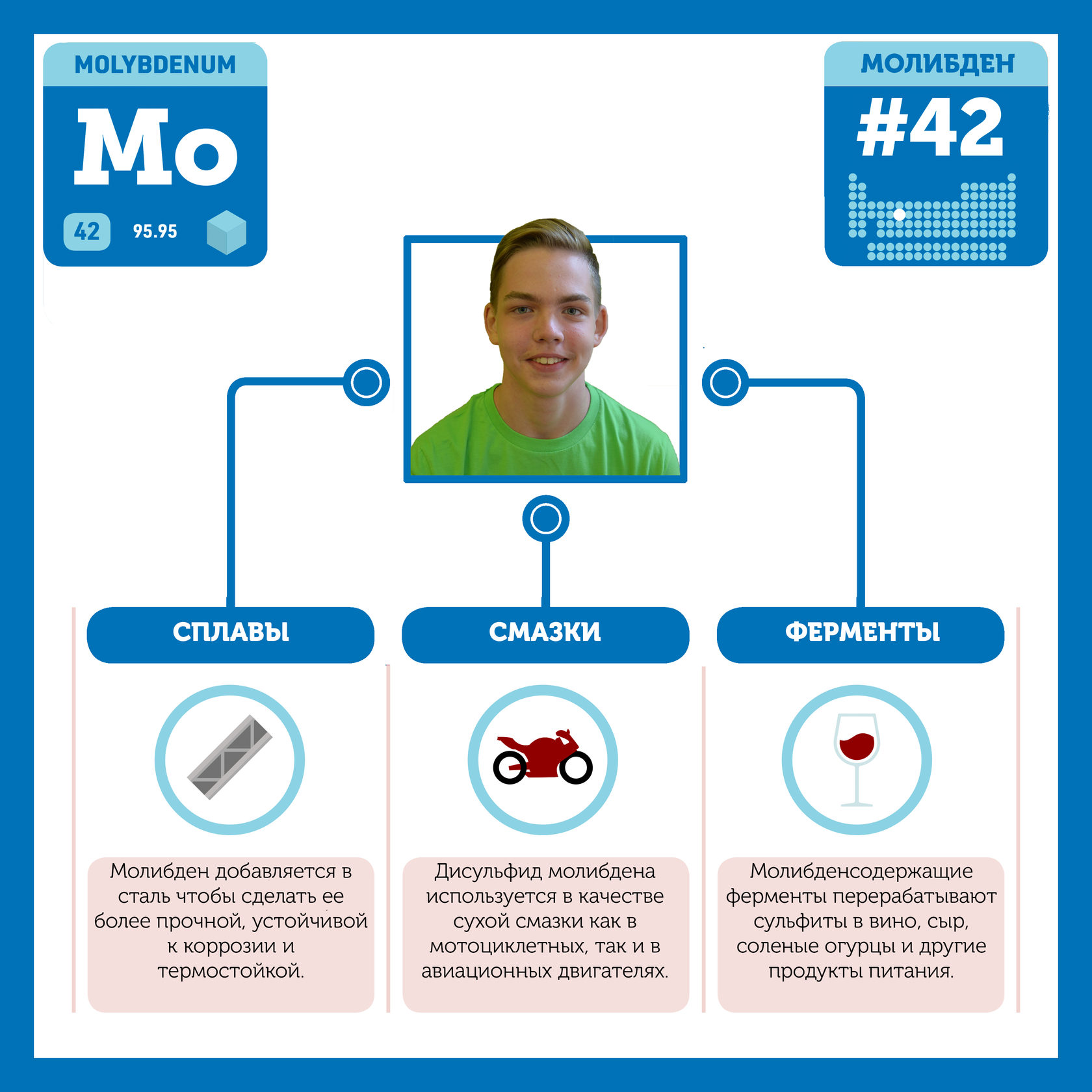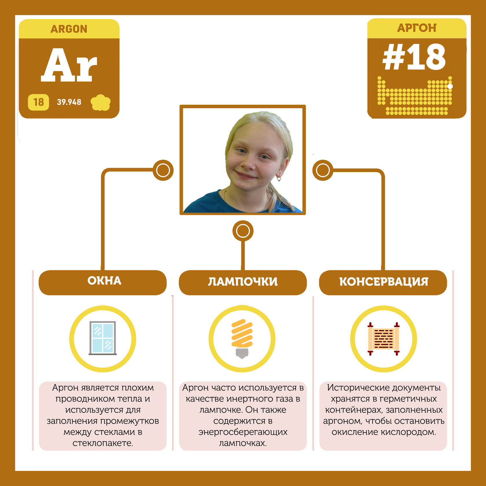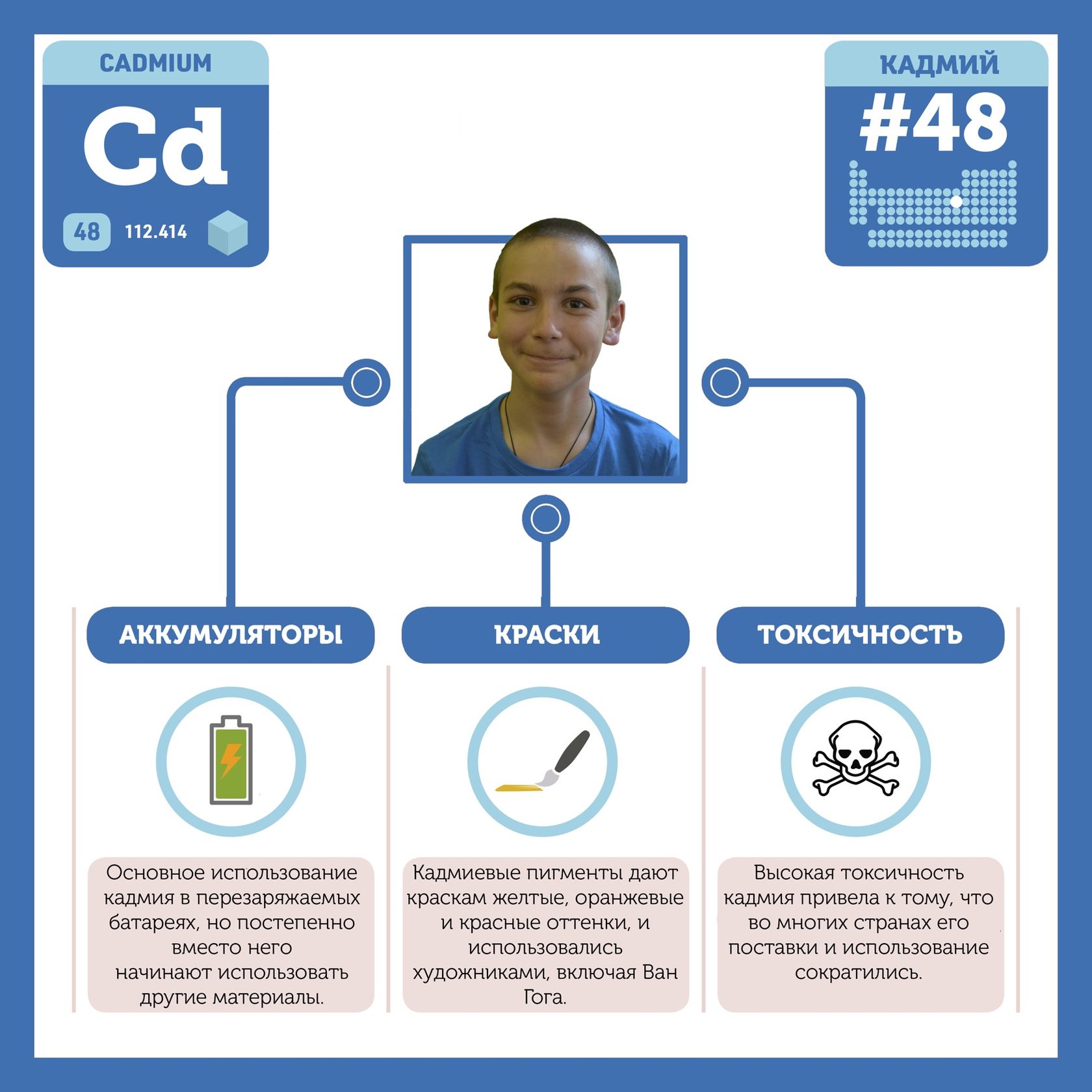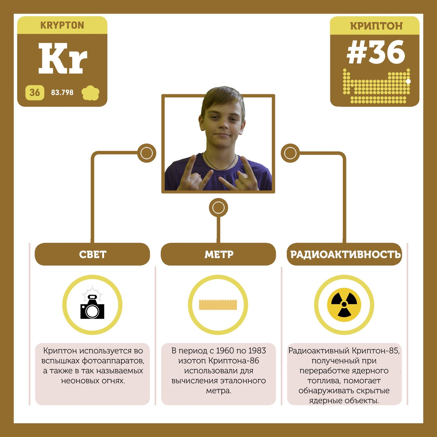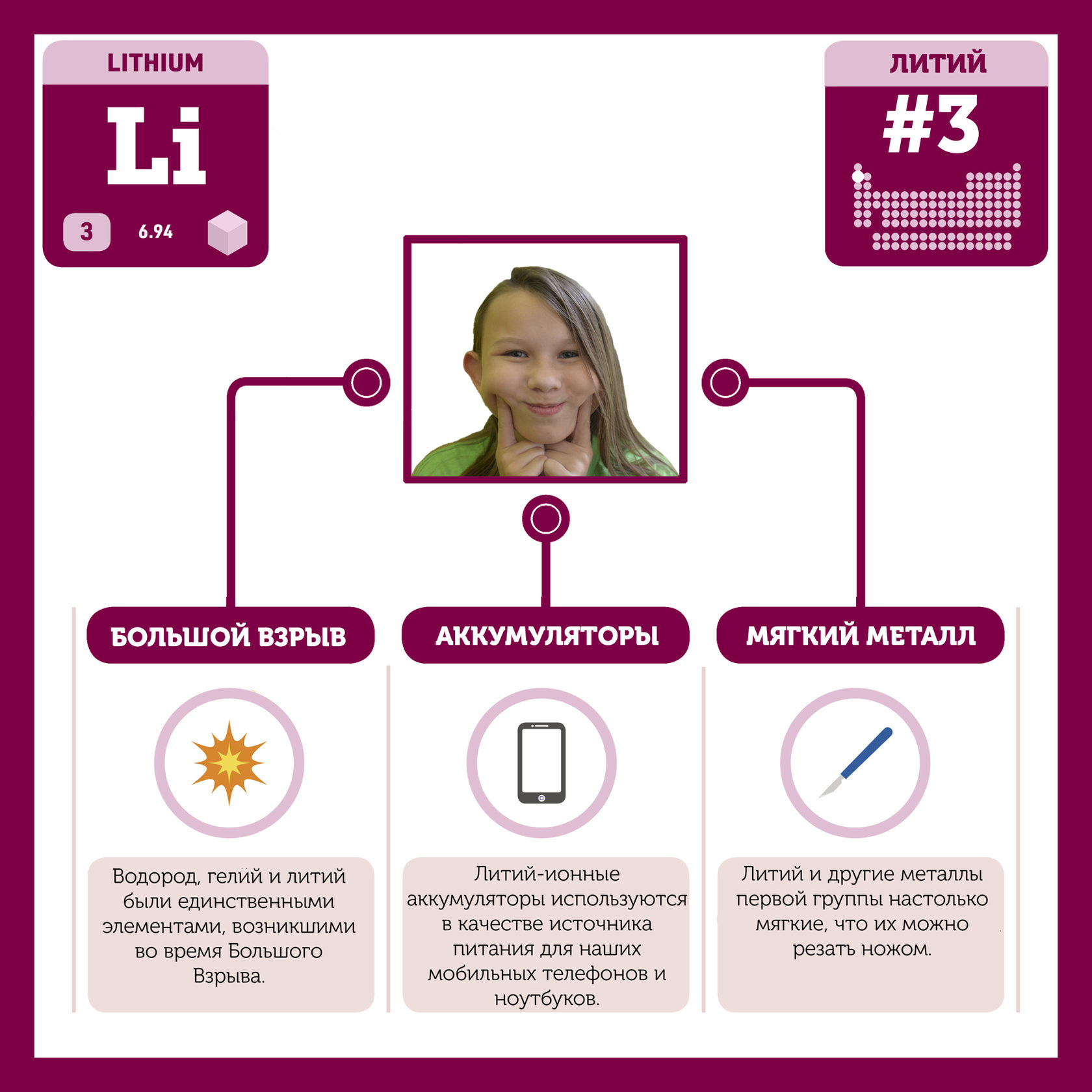 Для того, чтобы иметь возможность говорить от лица каждого элемента, ребята придумали персонажей - Росариков. Название Росарик произошло от сокращенной формулировки "участник детского отраслевого лагеря "Поколение Росатома" и по сути своей олицетворяет собой Атом вещества.
