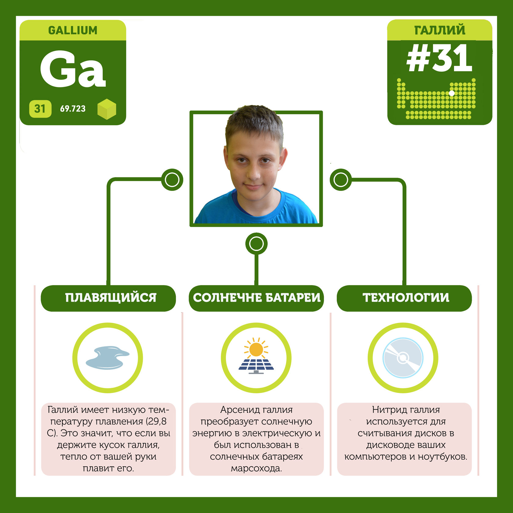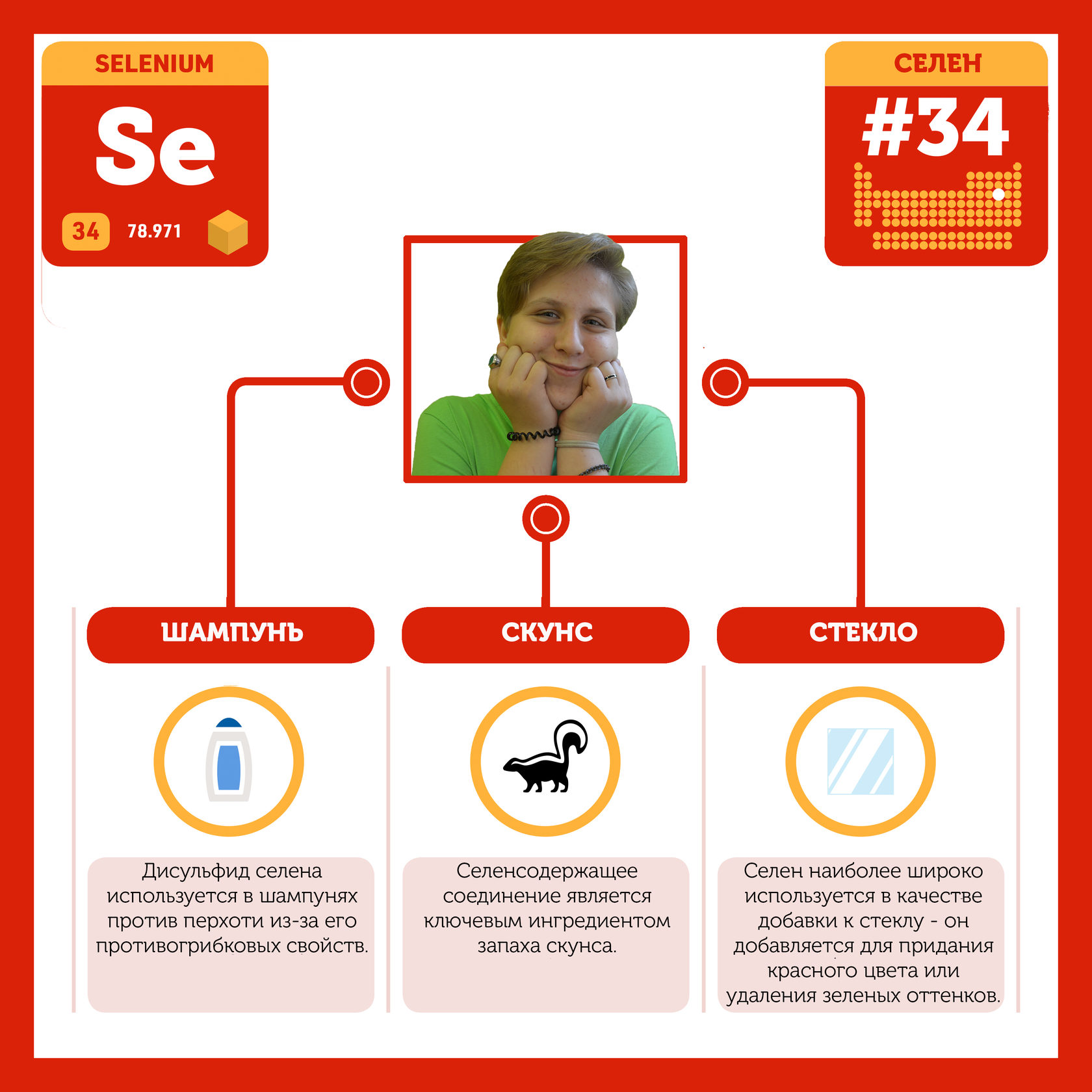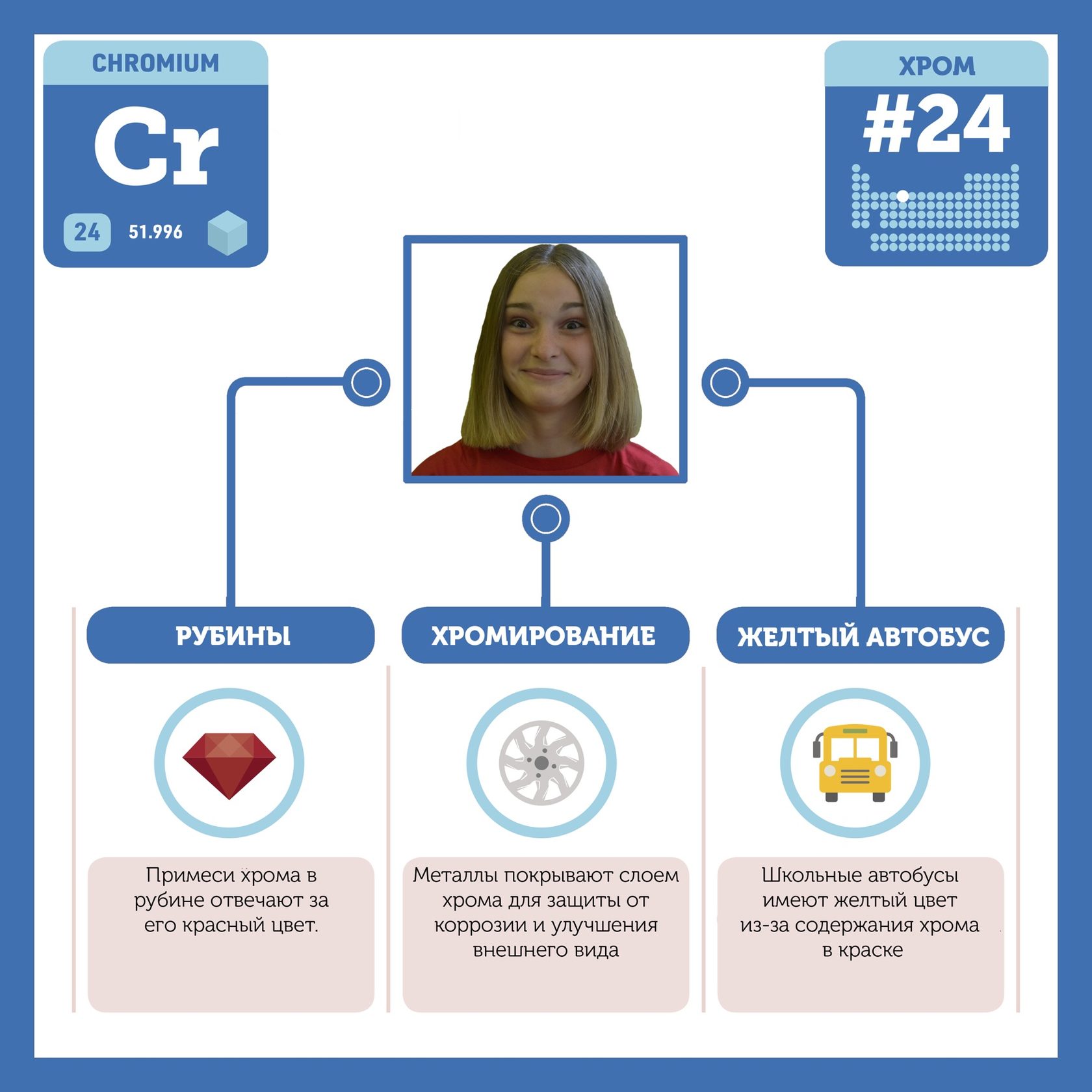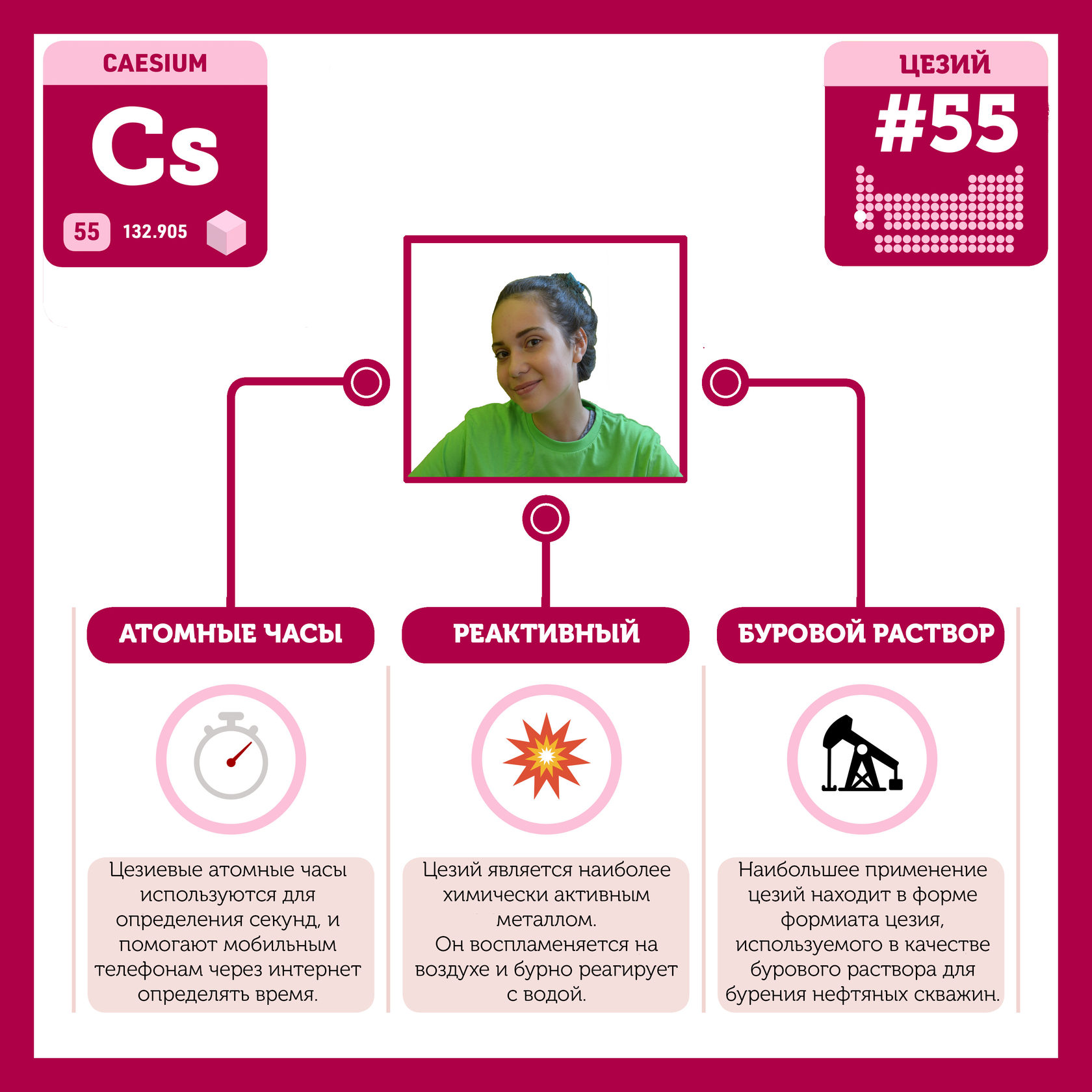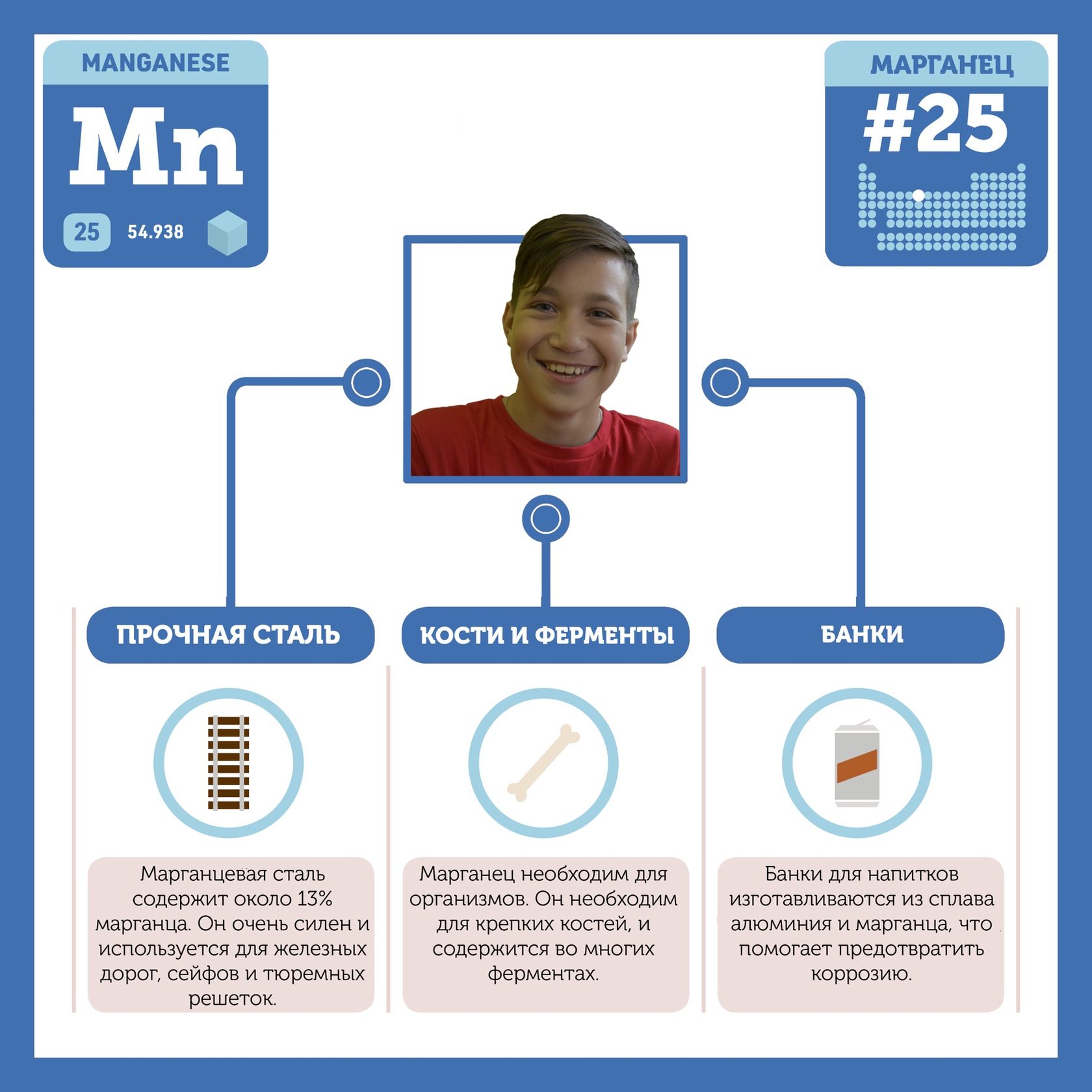 Для того, чтобы иметь возможность говорить от лица каждого элемента, ребята придумали персонажей - Росариков. Название Росарик произошло от сокращенной формулировки "участник детского отраслевого лагеря "Поколение Росатома" и по сути своей олицетворяет собой Атом вещества.