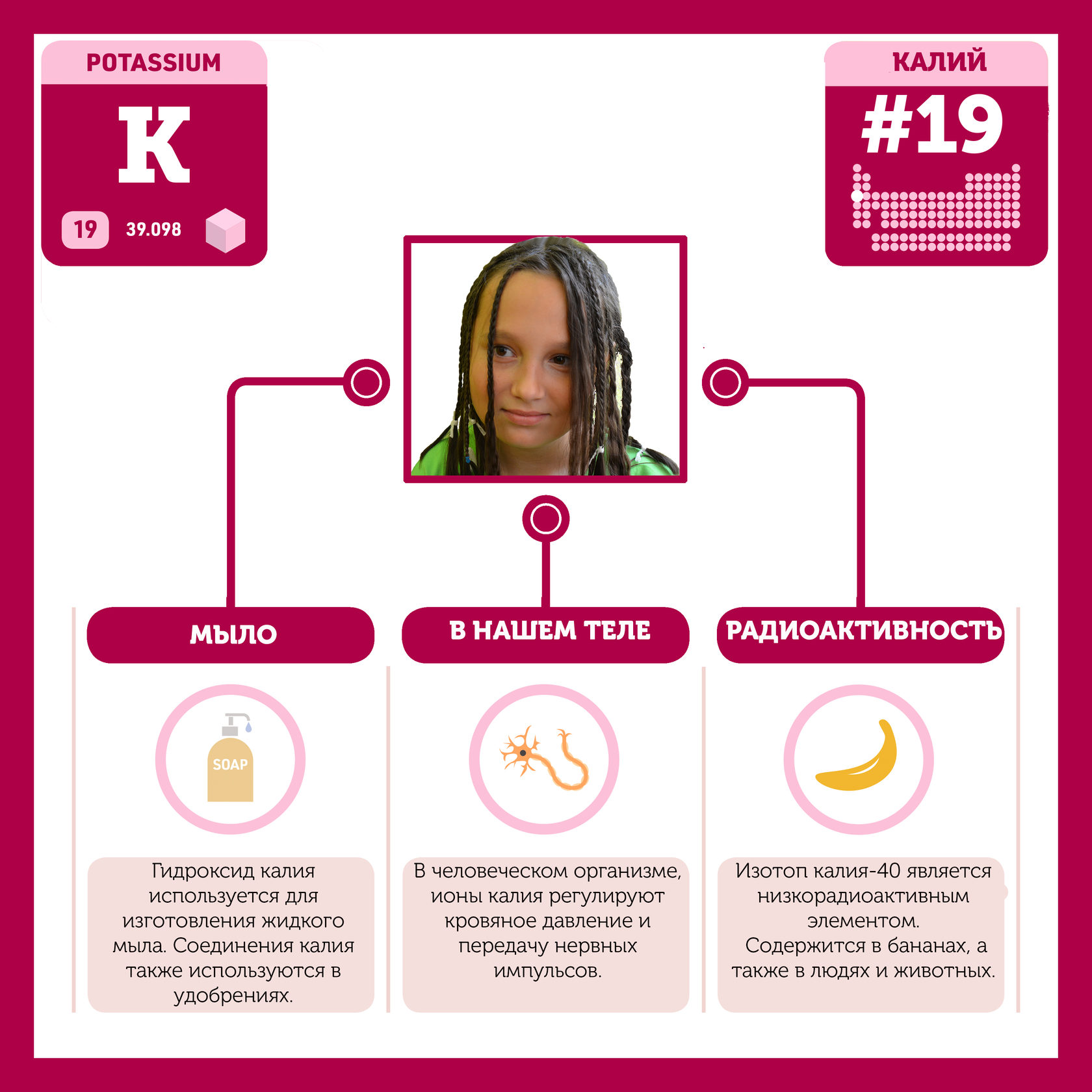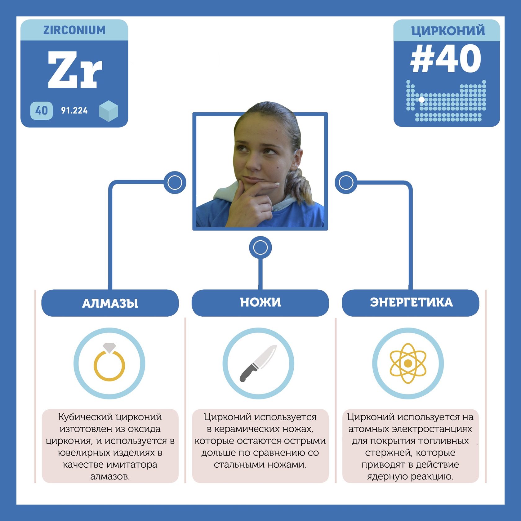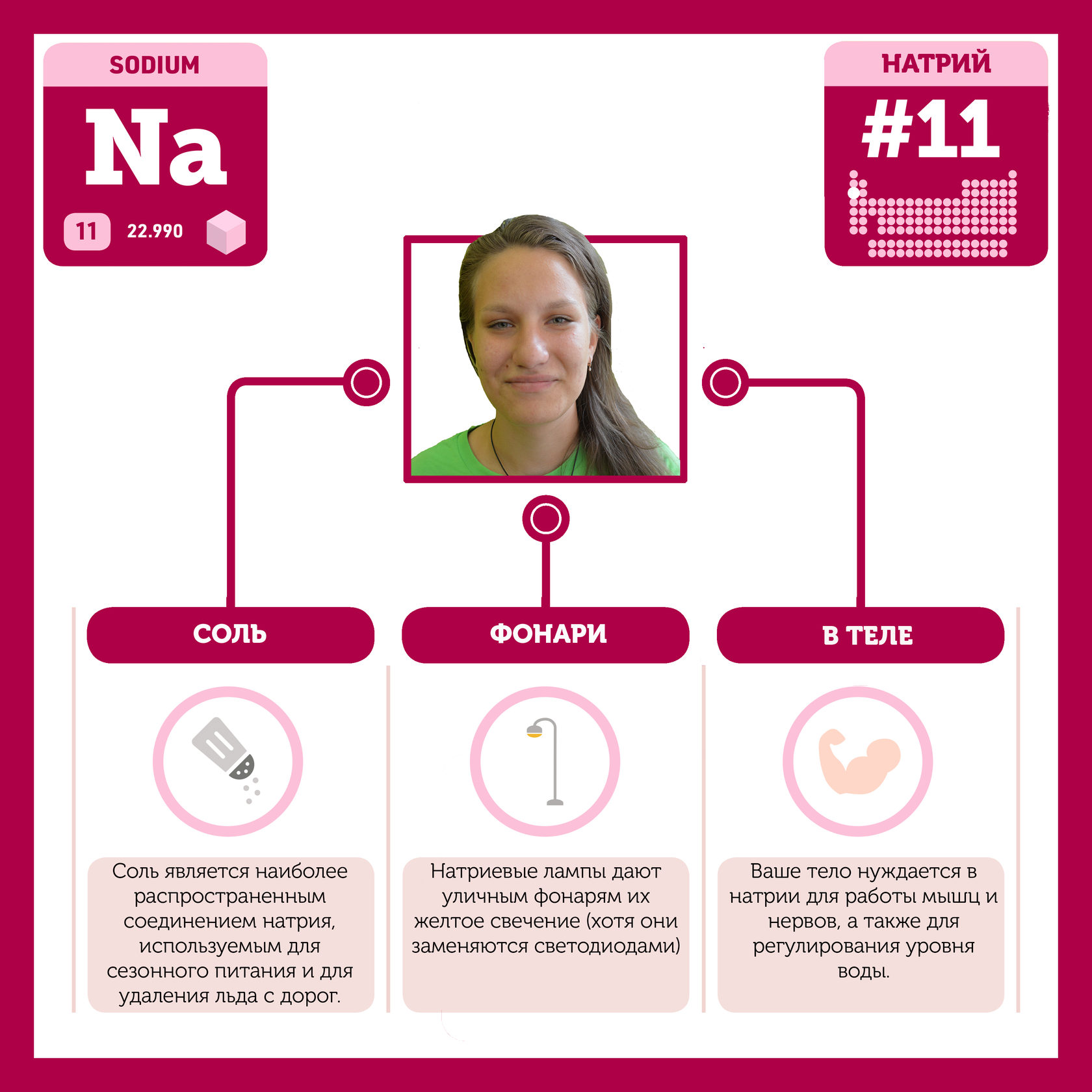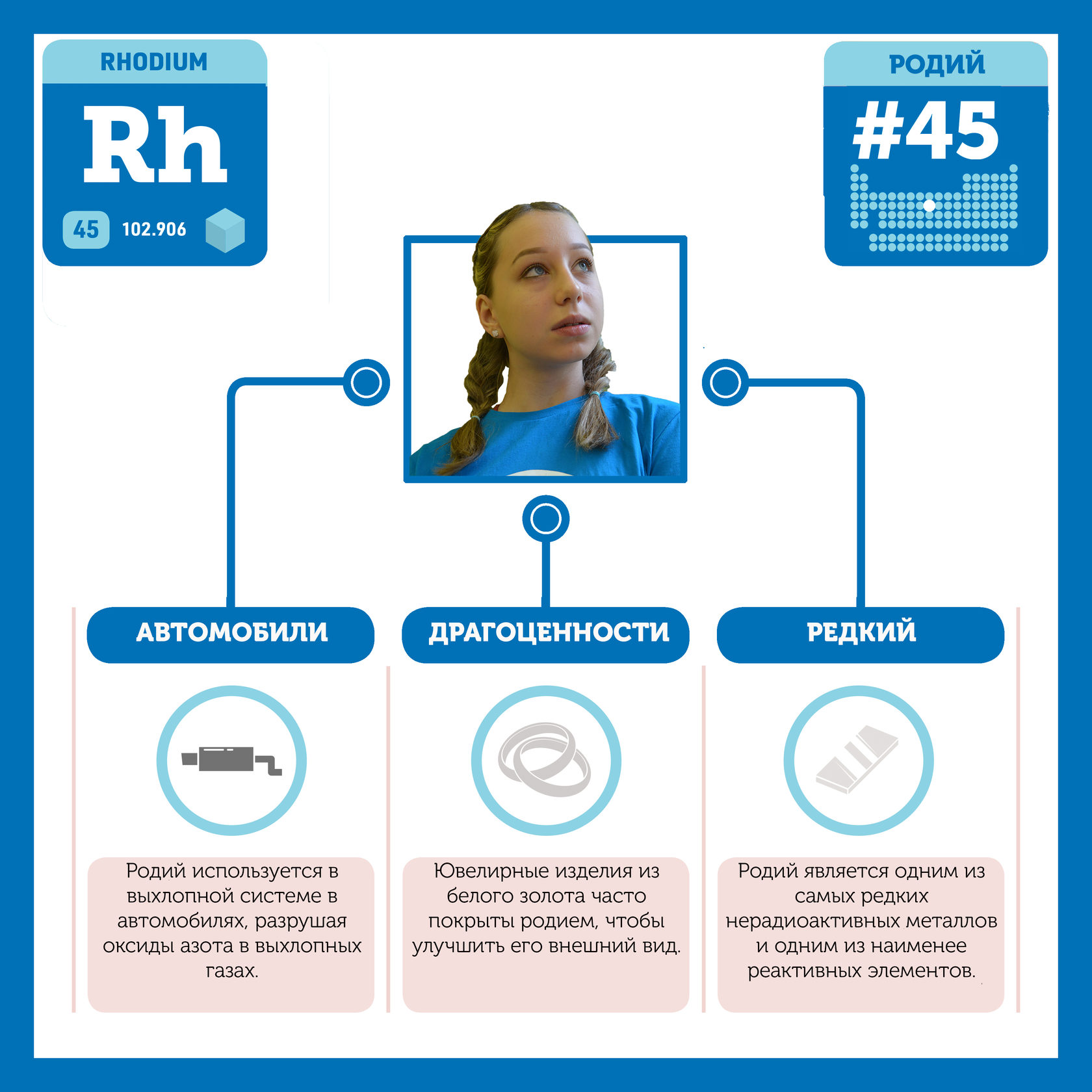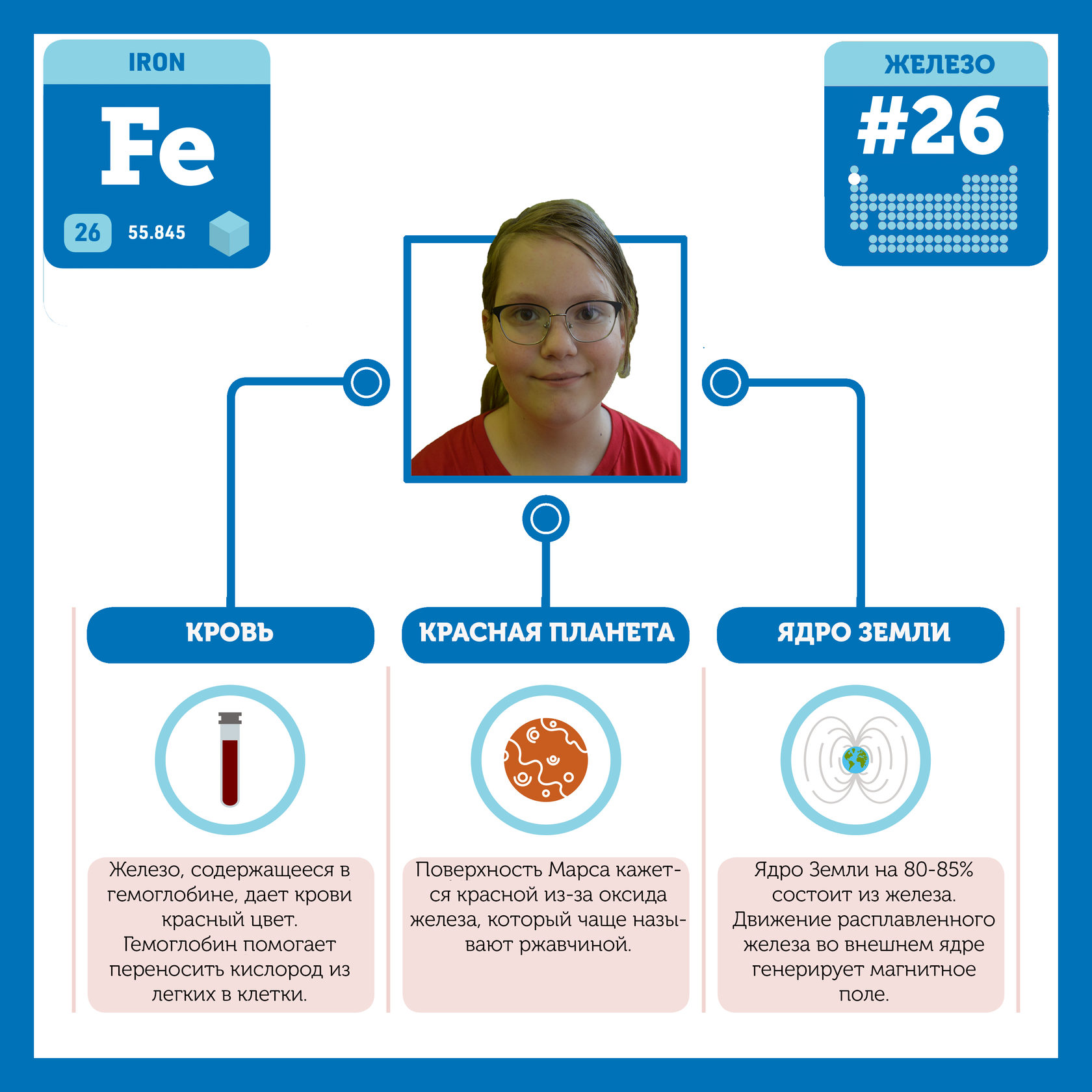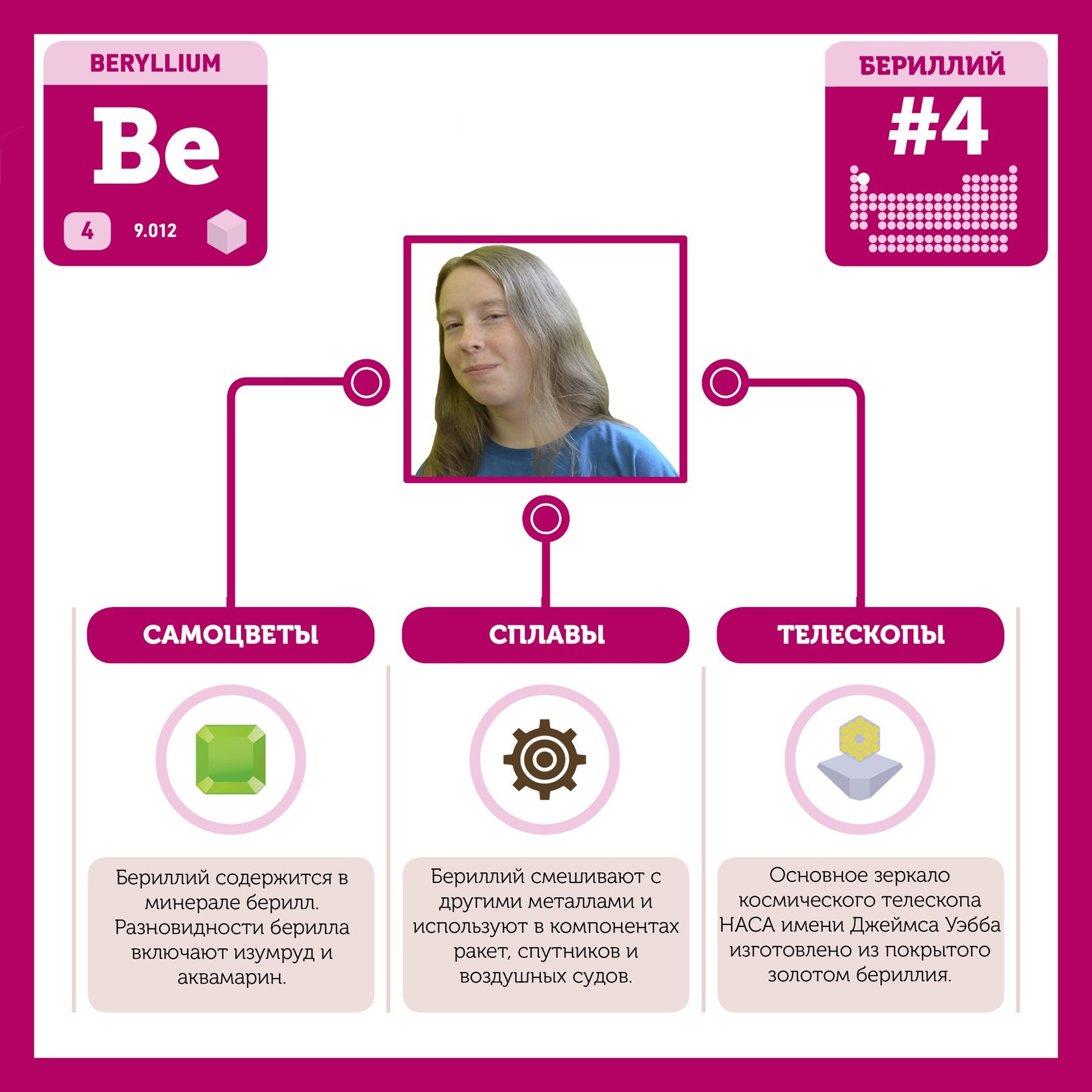 Для того, чтобы иметь возможность говорить от лица каждого элемента, ребята придумали персонажей - Росариков. Название Росарик произошло от сокращенной формулировки "участник детского отраслевого лагеря "Поколение Росатома" и по сути своей олицетворяет собой Атом вещества.
